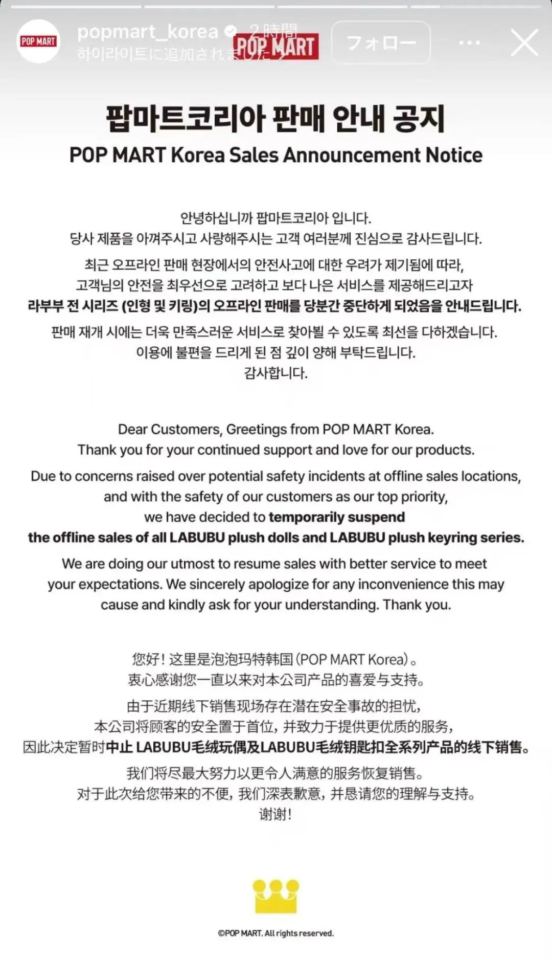 6月14日,泡泡玛特韩国(POP MART Korea)发布公告称,由于近期线下销售现场存在潜在安全事故的担忧中利网,公司将顾客的安全置于首位,并致力于提供更优质的服务,因此决定暂时中止LABUBU毛绒玩偶及LABUBU毛绒钥匙扣全系列产品的线下销售。公司将尽最大努力以更令人满意的服务恢复销售。